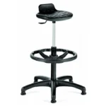 Butaco alto industrial para uso intensivo. Material: Piel integral – Poliuretano. Acolchado, impermeable y fácil lavado. Diámetro base 60cm con 5 puntas. Altura de silla ajustable, Giro de asiento en 360º, Aro apoyapies ajustable en altura. Altura asiento: Min 55 cm Max 76 cm – Altura aro: Min 18 cm Max 43 cm.