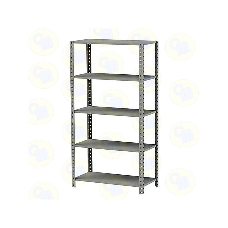 Cinco entrepaños estante hueco/uña, parales estante hueco/uña. 1 refuerzo / 2 refuerzos. Tornillos zincados, cabeza plana. Sistema de uña / hueco. resistencia de 50 kg. / 55 kg. Dispersos en área total.